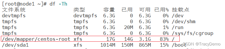 [root@node1 ~]# df -th 文件系统 类型 容量 已用 可用 已用% 挂载点 devtmpfs devtmpfs 6.3g 0 6.3g 0% /dev tmpfs tmpfs 6.3g 0 6.3g 0% /dev/shm tmpfs tmpfs 6.3g 20m 6.3g 1% /run tmpfs tmpfs 6.3g 0 6.3g 0% /sys/fs/cgroup /dev/mapper/centos-root xfs 37g 14g 24g 38% / /dev/sda1 xfs 1014m 150m 865m 15% /boot