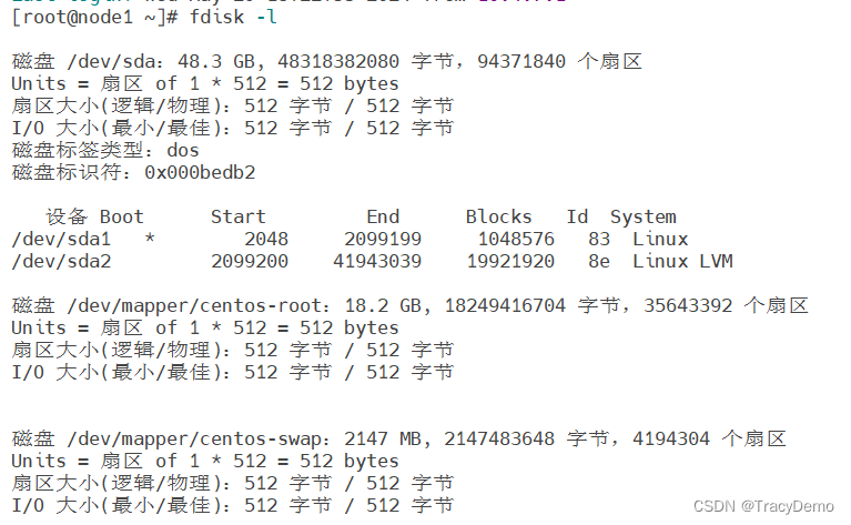 [root@node1 ~]# fdisk -l 磁盘 /dev/sda:48.3 gb, 48318382080 字节,94371840 个扇区 units = 扇区 of 1 * 512 = 512 bytes 扇区大小(逻辑/物理):512 字节 / 512 字节 i/o 大小(最小/最佳):512 字节 / 512 字节 磁盘标签类型:dos 磁盘标识符:0x000bedb2 设备 boot start end blocks id system /dev/sda1 * 2048 2099199 1048576 83 linux /dev/sda2 2099200 41943039 19921920 8e linux lvm /dev/sda3 41943040 94371839 26214400 83 linux 磁盘 /dev/mapper/centos-root:18.2 gb, 18249416704 字节,35643392 个扇区 units = 扇区 of 1 * 512 = 512 bytes 扇区大小(逻辑/物理):512 字节 / 512 字节 i/o 大小(最小/最佳):512 字节 / 512 字节 磁盘 /dev/mapper/centos-swap:2147 mb, 2147483648 字节,4194304 个扇区 units = 扇区 of 1 * 512 = 512 bytes 扇区大小(逻辑/物理):512 字节 / 512 字节 i/o 大小(最小/最佳):512 字节 / 512 字节