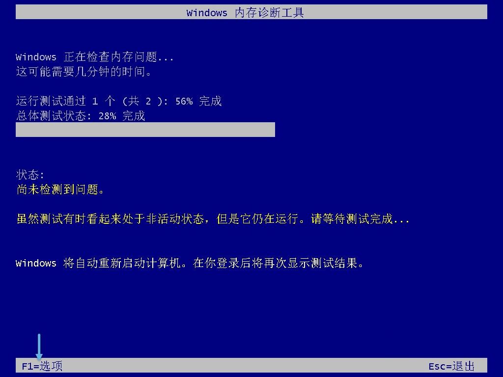 重启后,会直接进入 windows 内存诊断工具的测试界面。