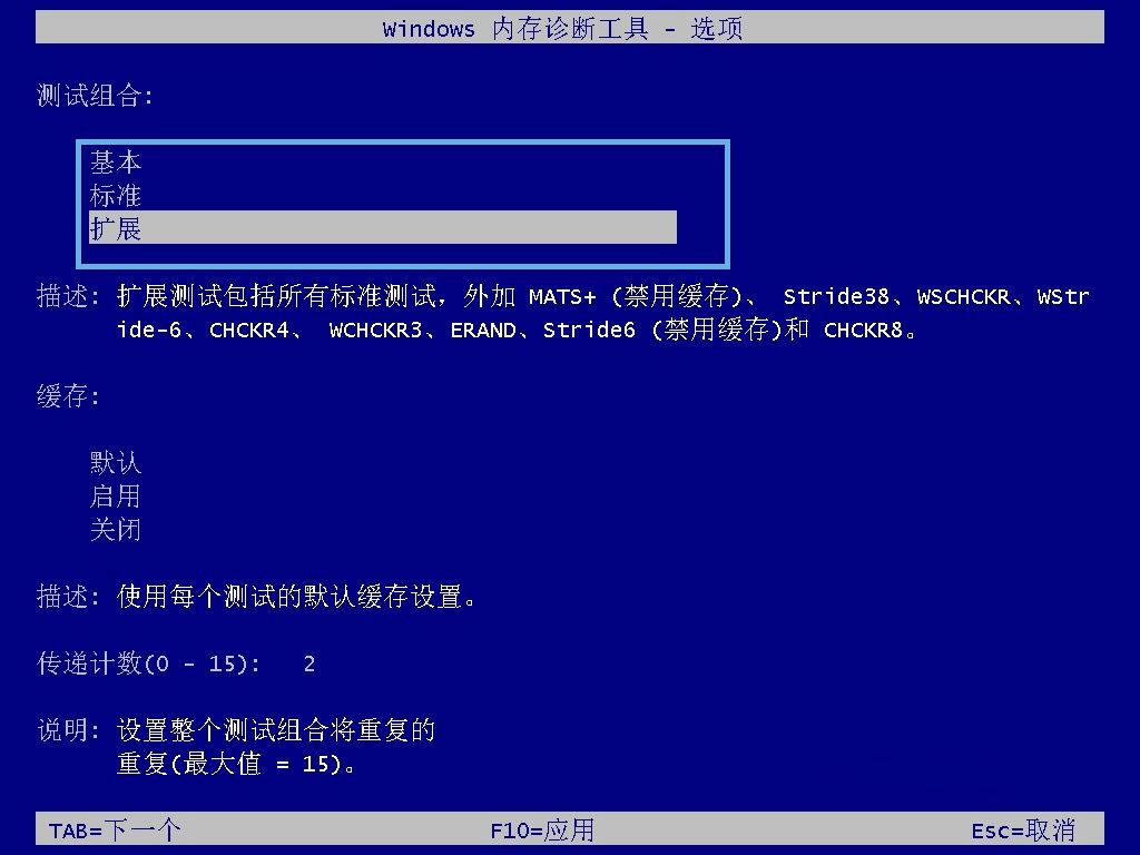 - 扩展:扩展测试包括所有标准测试,外加 mats+(禁用缓存)、stride38、wschckr、wstride-6、chckr4、wchckr3、erand、stride6(禁用缓存)和 chckr8。可能需要很长时间,但有助于找出导致内存问题的根本原因。