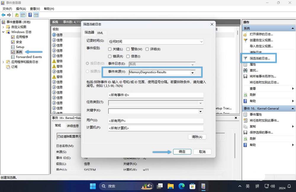 3、在弹出的筛选窗口中,找到「事件来源」下拉菜单,并勾选「memorydiagnostics-results」选项。然后点击「确定」根据内存诊断结果过滤日志。
