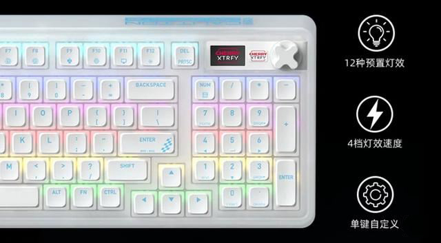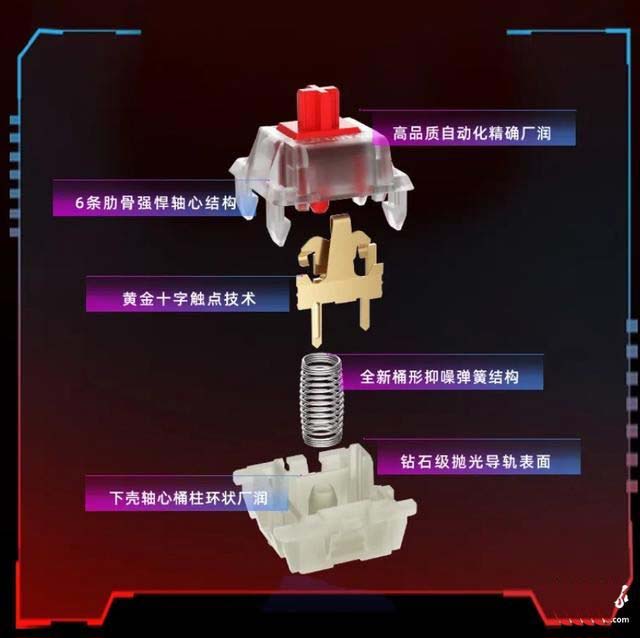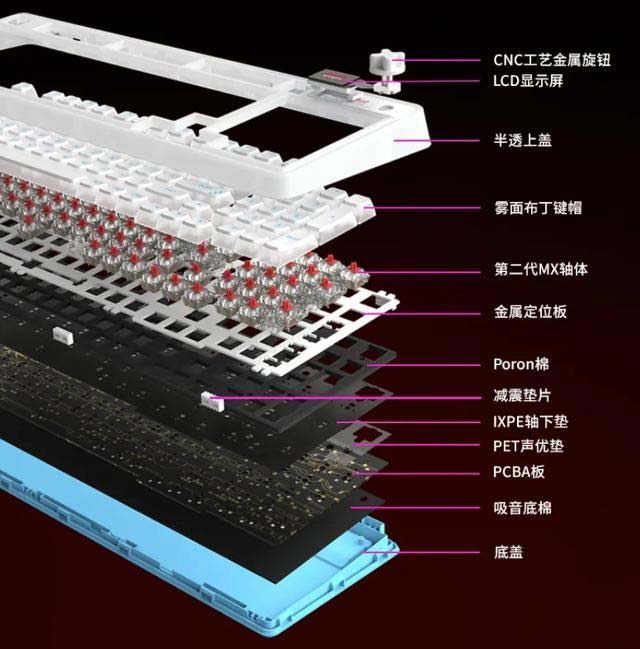 该键盘采用 4 层消音减震结构,支持全键热插拔(3 脚或 5 脚轴),官方搭载 mx2a 轴体。