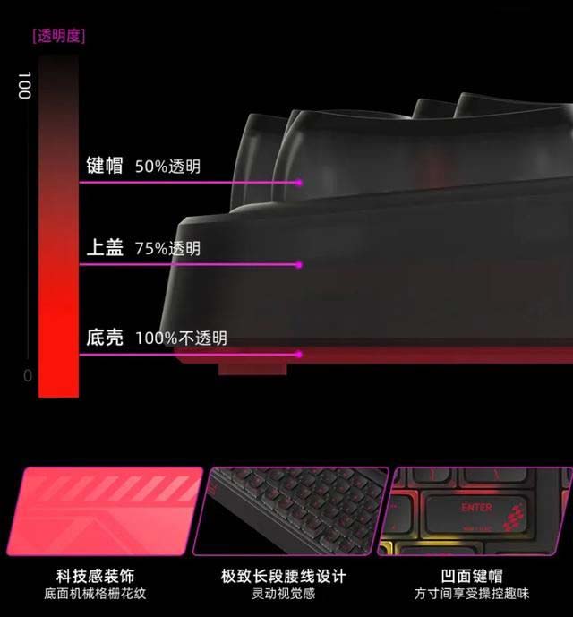 樱桃 pixiu98 采用渐变透明外壳,支持环绕氛围灯,右上角有一个 lcd 小屏幕可显示各项信息、屏保等。