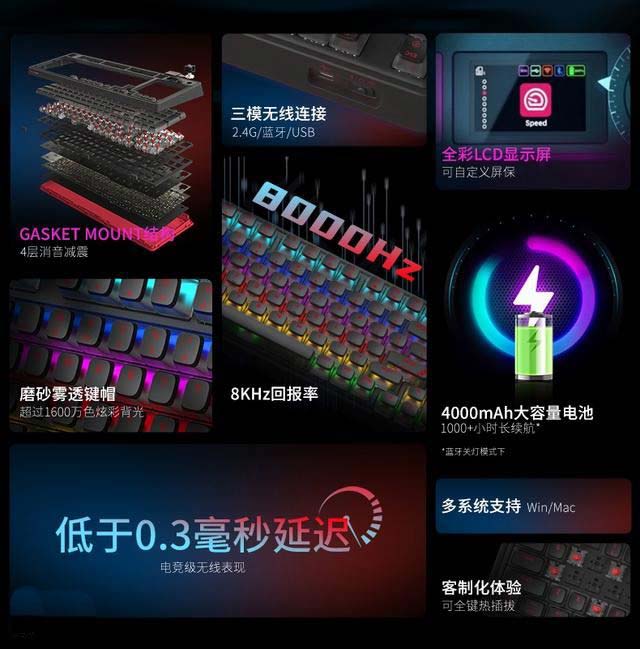 pixiu98 支持 8000hz 有线回报率、4000hz 无线回报率,支持 2.4g / 蓝牙 / usb 三模连接。