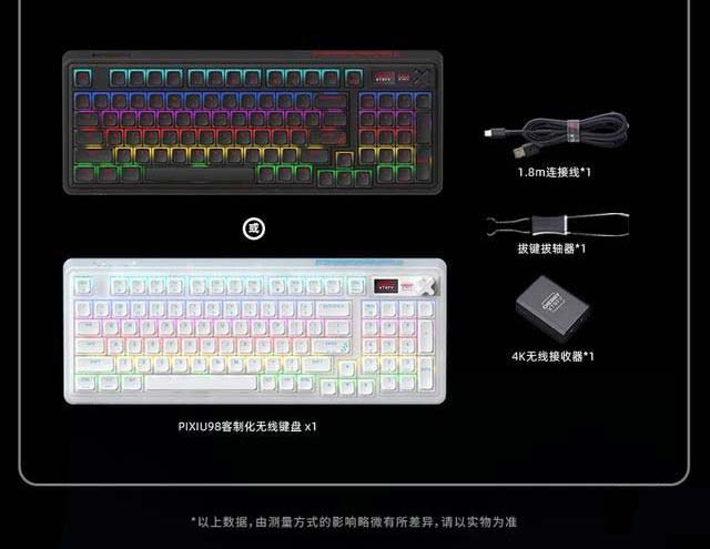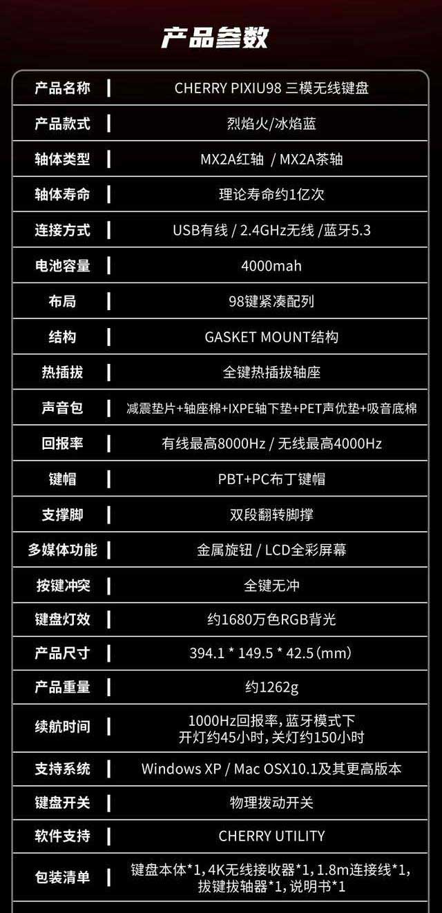 cherry 樱桃 pixiu98 客制化无线键盘可选红轴、茶轴两个版本,定价 1099 元,现已在京东开启预售,12 月 26 日 20:00 正式开售,我们附参数表如下: