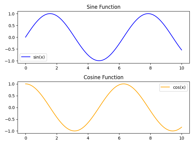axs[0].plot(x, y1, label='sin(x)', color='blue')