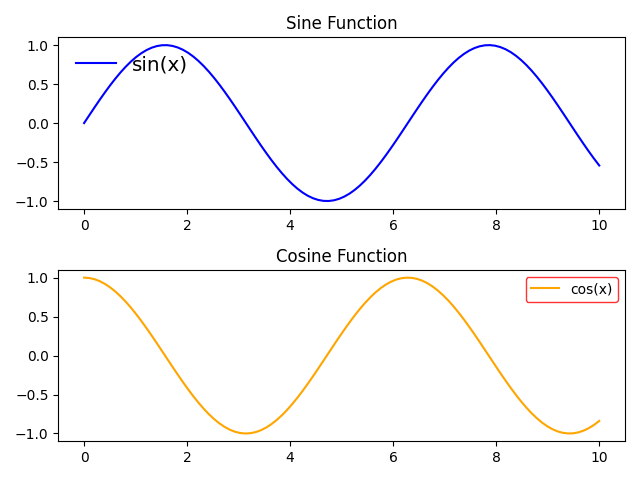 plt.show()在这个示例中,我们分别为两个子图设置了不同的图例样式。第一个子图的图例没有边框,背景颜色为浅灰色,字体大小为x-large,边缘颜色为蓝色。第二个子图的图例有边框,背景颜色为白色,字体大小为medium,边缘颜色为红色。