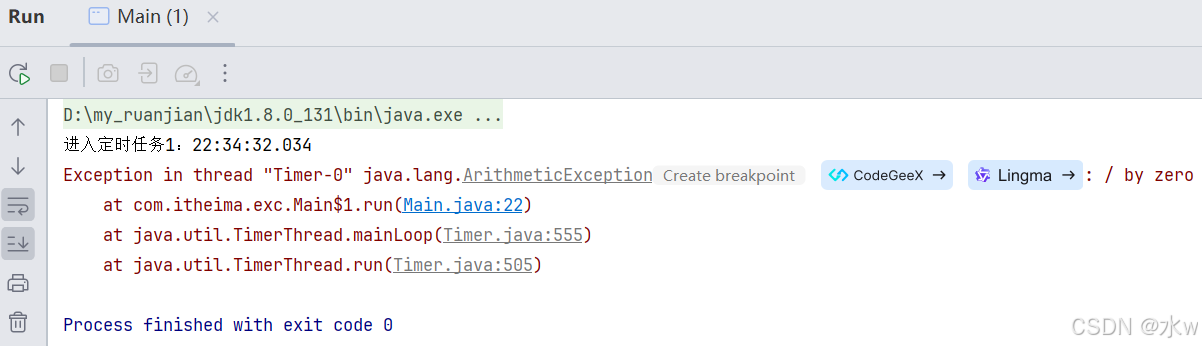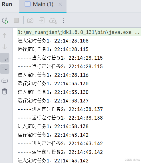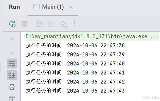 定时任务1第一次运行时会在1秒后进入并输出时间。由于在run()方法中调用了sleep(3),这意味着此任务在执行期间会阻塞3秒。这会导致timertask的后续执行被延迟。