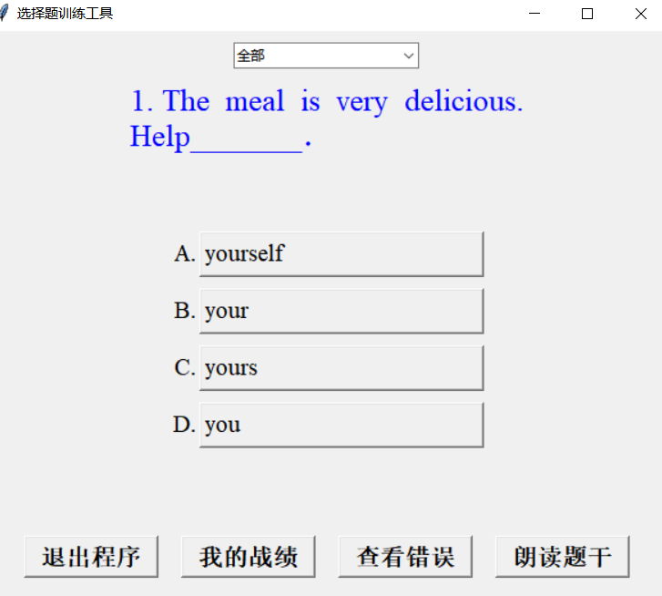 运行 python 程序,tkinter gui界面会自动加载,用户可以在顶部下拉框选择不同的课程,然后开始答题,结束前查看战绩,回顾错误题目,还可以点朗读通过音频功能听题干。