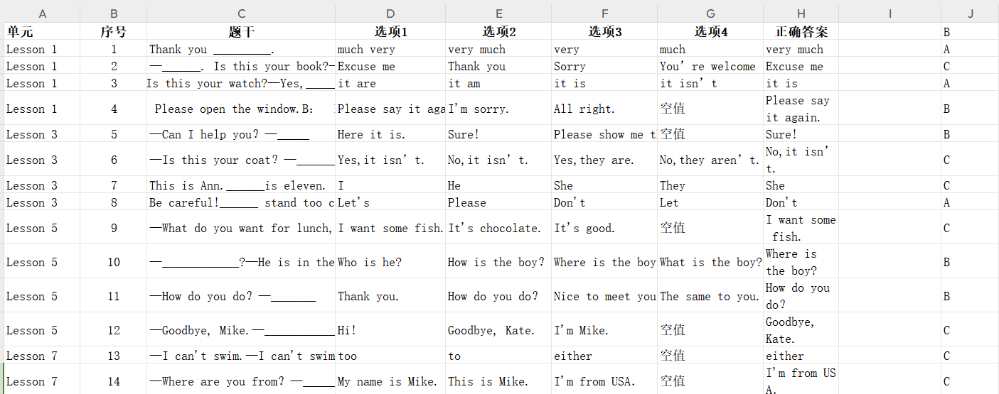 excel 文件格式:确保题库文件【选择题.xlsx】的格式正确,每个问题必须包含单元、序号、题干、选项和正确答案等字段。