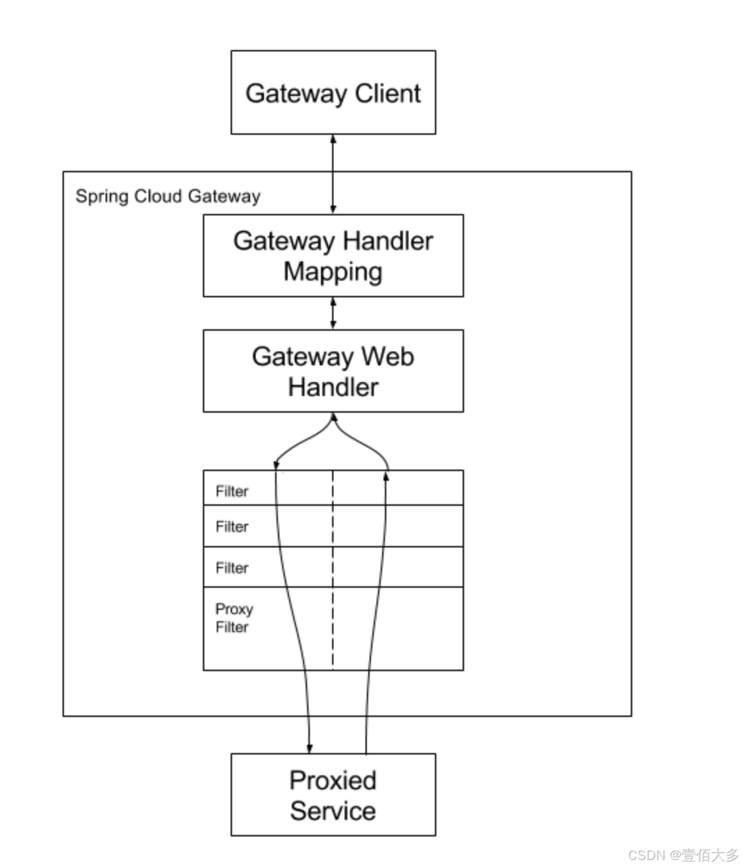 客户端向 spring cloud gateway 发出请求。如果 gateway handler mapping 确定请求与路由匹配,则将其发送到 gateway web handler。此处理程序通过特定于该请求的过滤器链运行该请求。过滤器被虚线分开的原因是过滤器可以在发送代理请求之前和之后运行逻辑。所有“前”过滤器逻辑都会执行。然后发出代理请求。发出代理请求后,运行“后”过滤器逻辑。