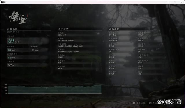 黑神话悟空,整体性能表现也比较正常,69帧的平均帧率,也符合rtx 4060搭配酷睿ultra 7 265k以及z890m战斧的整体性能表现。