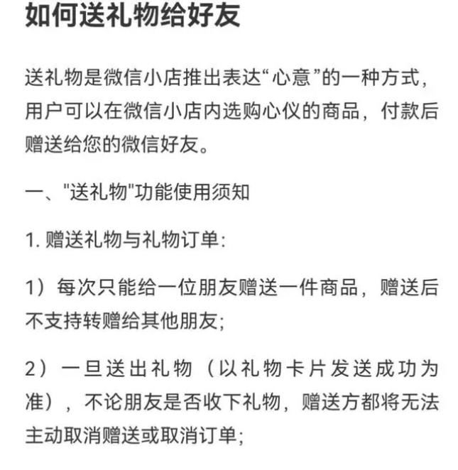 赠送方每次只能给一位朋友赠送一件商品,赠送后不支持转赠给其他朋友。而且一旦送出礼物后,不论朋友是否收下礼物,赠送方在24小时内都无法主动取消赠送或取消订单。若朋友超过24小时未收下礼物,订单将自动取消并退款给赠送方。