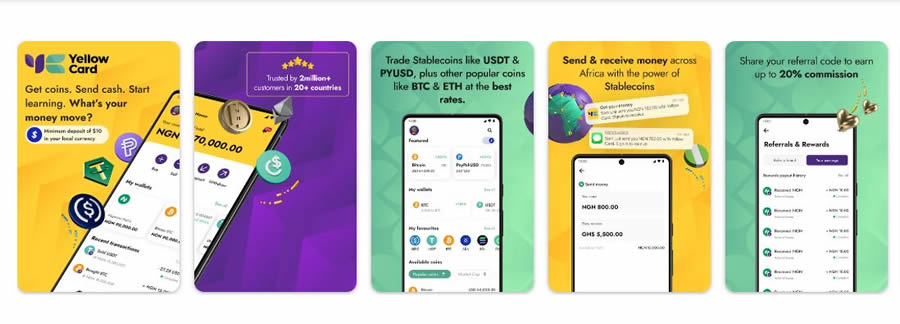 yellow card 允许用户即时发送和接收任何平台上的加密货币。用户可以安全地将资金存储在 yellow card 钱包中,直到准备提现时。