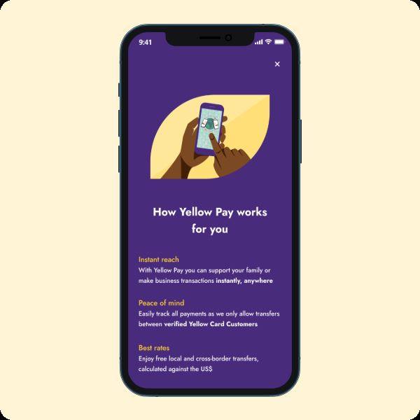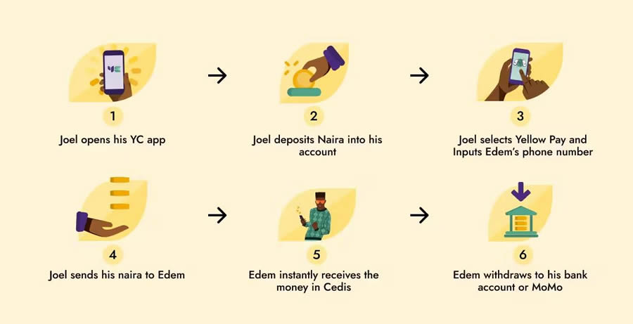 yellow pay 使用户能够将款项转账到收款人注册的手机号码。收款人根据当时的汇率,按当地货币金额收到相应款项。如果收款人不是 yellow card 客户,他们将收到注册通知。收到款项后,收款人可以立即将相应金额以当地货币提取到银行账户或移动支付(momo)账户。
