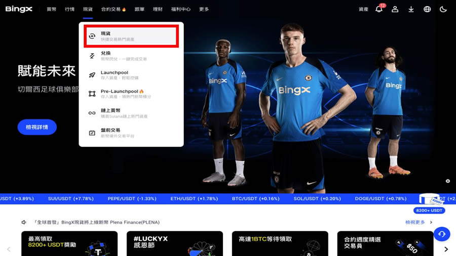 - 进入网格交易界面前往bingx 官网,依序选择「现货」,然后找到btc/usdt 的交易对。