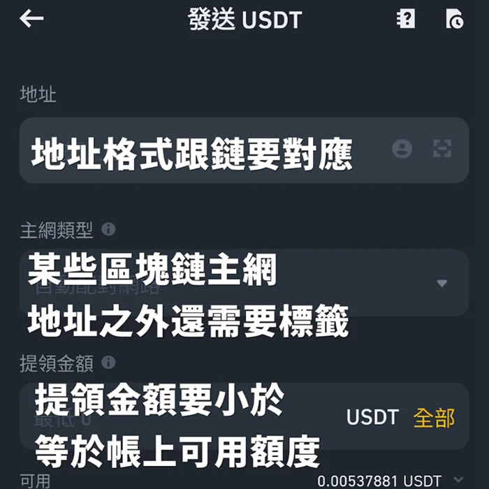 无论是交易所提现,或使用加密货币钱包转帐,一定要再三检查确认链与地址正确,只要没把握就只先转小额测试,测试成功后再转剩下余额。多花一次手续费,但避免转错无法追回的惨况。