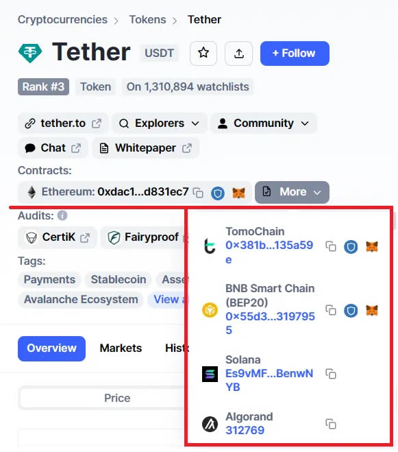 进到该币的页面之后,可以在左边看到一个contracts,这边预设显示的是在以太坊链上usdt 币的合约地址,如果想要寻找的是其他链上的合约地址,请从右边的more 里寻找。