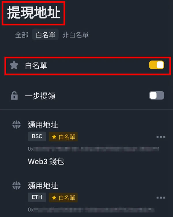 白名单功能在提领地址中可以开启,开启后就能设定白名单,白名单可以指定币种& 链,未来提现时系统会自动配对,只能转给对应的地址,也不用每次重新复制贴上,不只降低被盗风险,也大幅降低转错地址的风险。