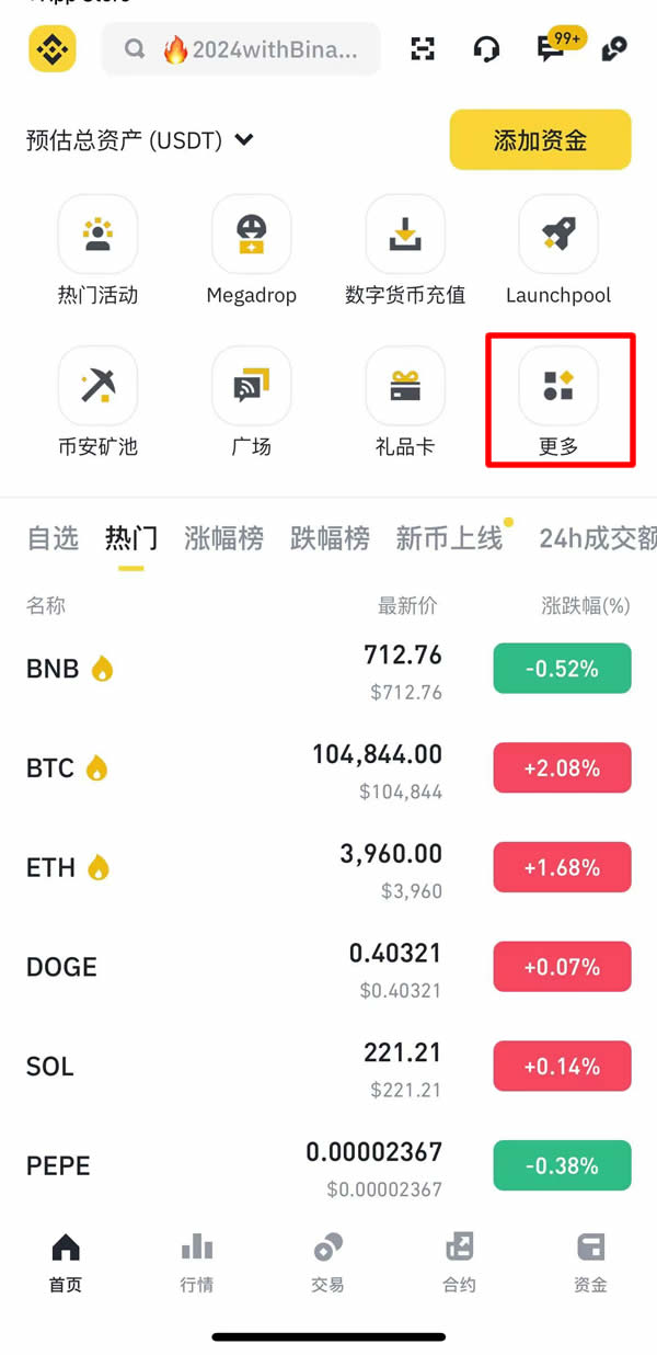 如果你已经拥有了币安的帐户,也通过kyc 身份验证,接着就打开币安app(官方注册 官方下载),点选右上角的九个点点,进入到币安的所有功能中。