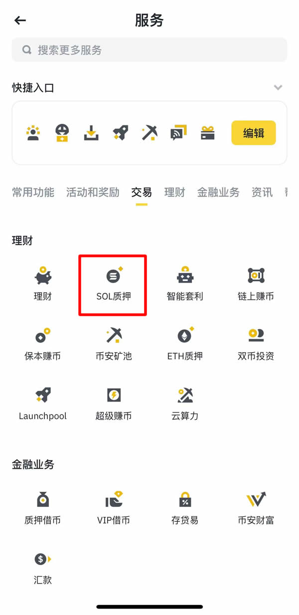 接着往下找到「理财」,里面有一个「sol 质押」选项,点进去就可以到币安的sol 质押设定页面。