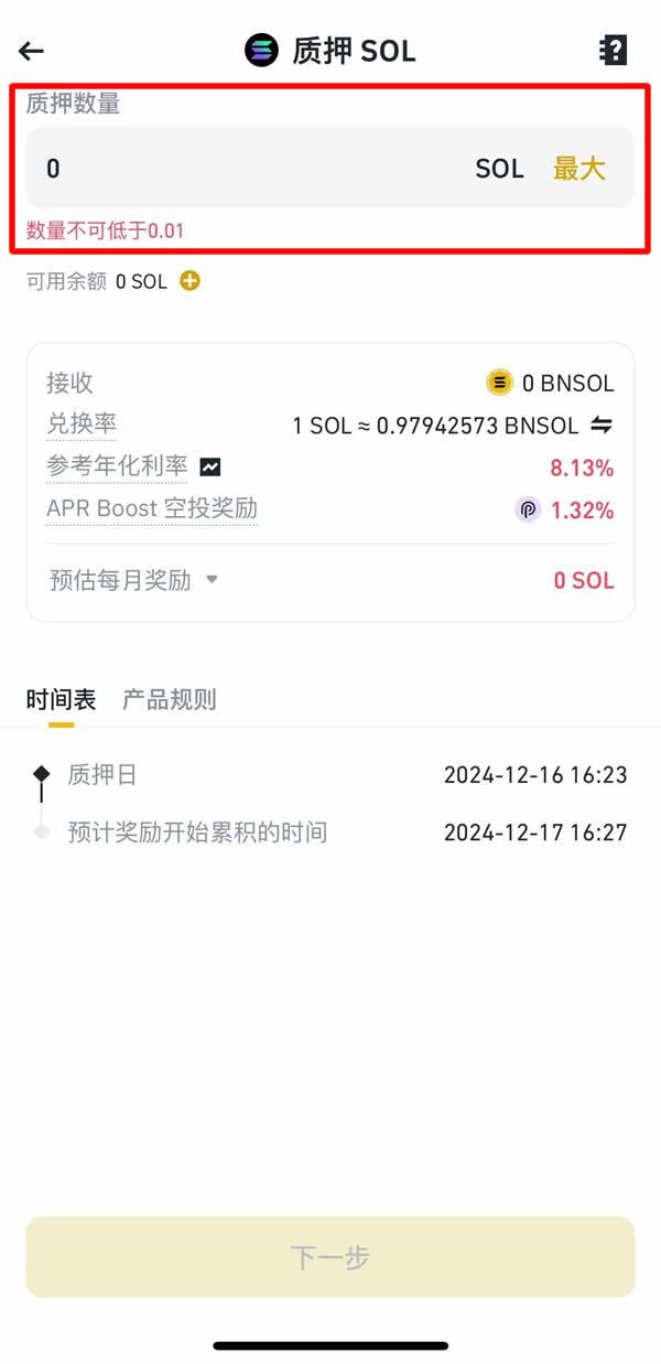 在币安平台上,sol 质押的最低数量是0.01 sol 左右。