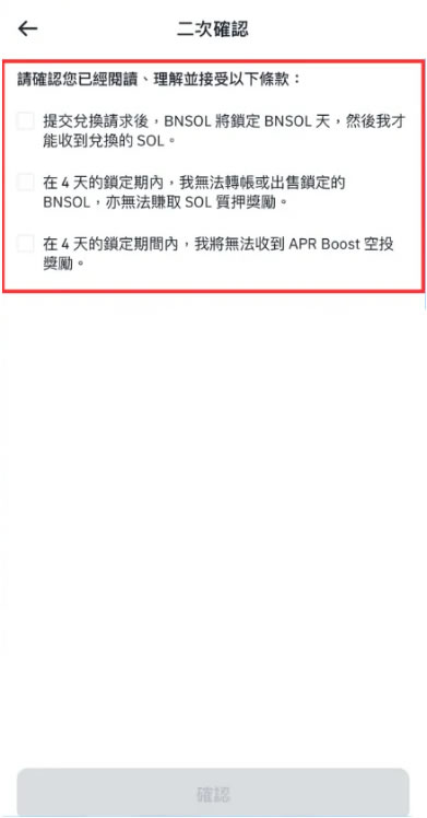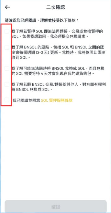如果确定都没问题,就按「下一步」,币安会请你确认质押相关的风险与注意事项,如果都没问题就勾选按「确认」,就完成质押了。