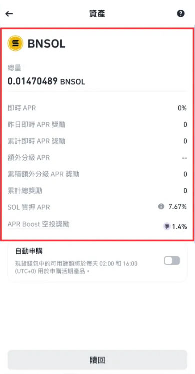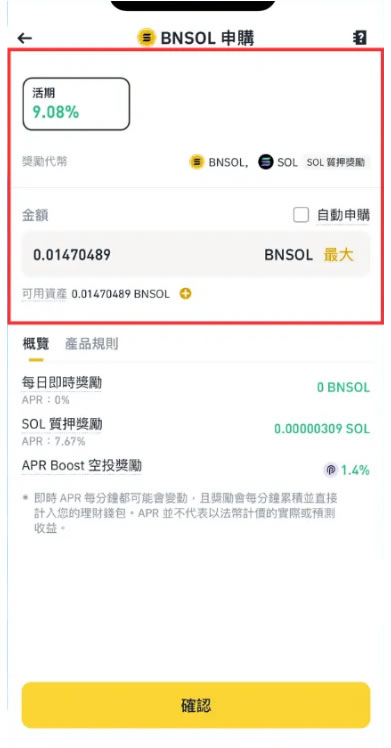 进入到币安sol 质押页面后,你会看到质押金额、预估年化收益、起算的时间以及你会收到bnsol。