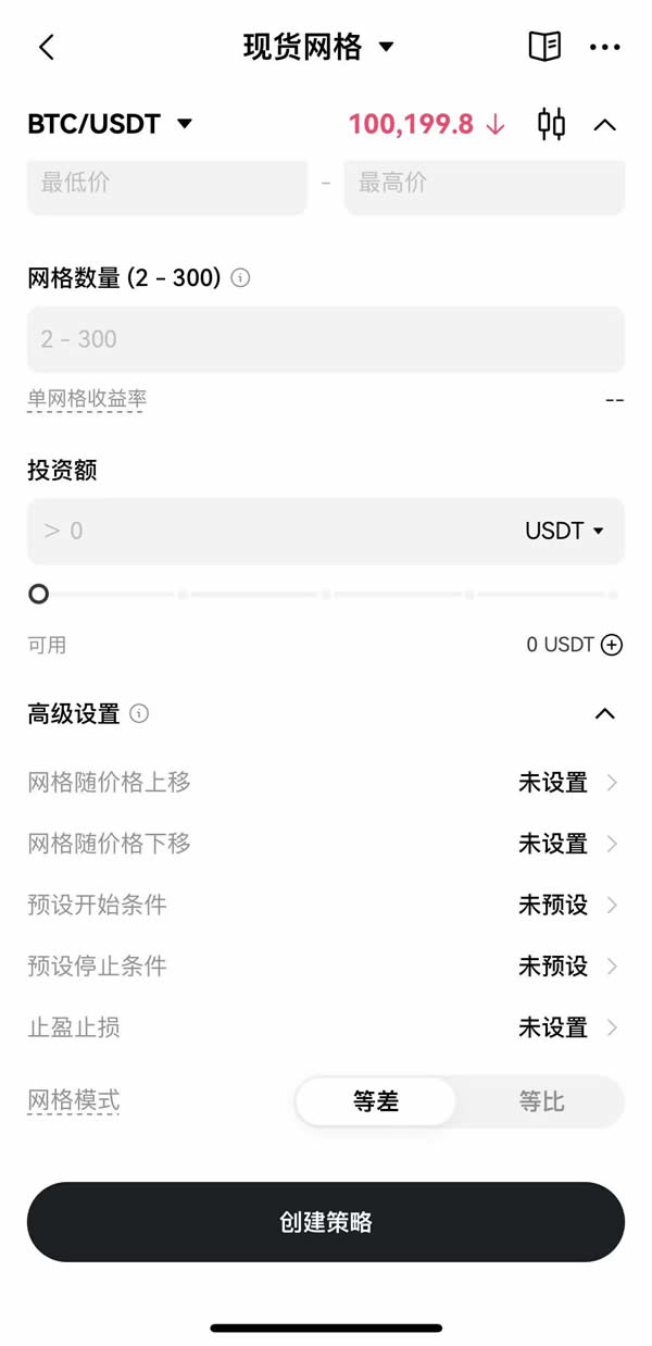 - 价格区间(usdt):设定你想要交易的价格范围,超出范围就会自动停止网格交易。