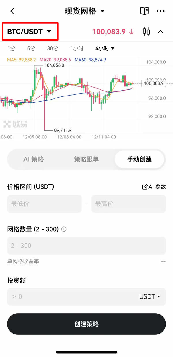 进入现货网格页面后,从画面左上角,点击选择你要执行现货网格的币种。