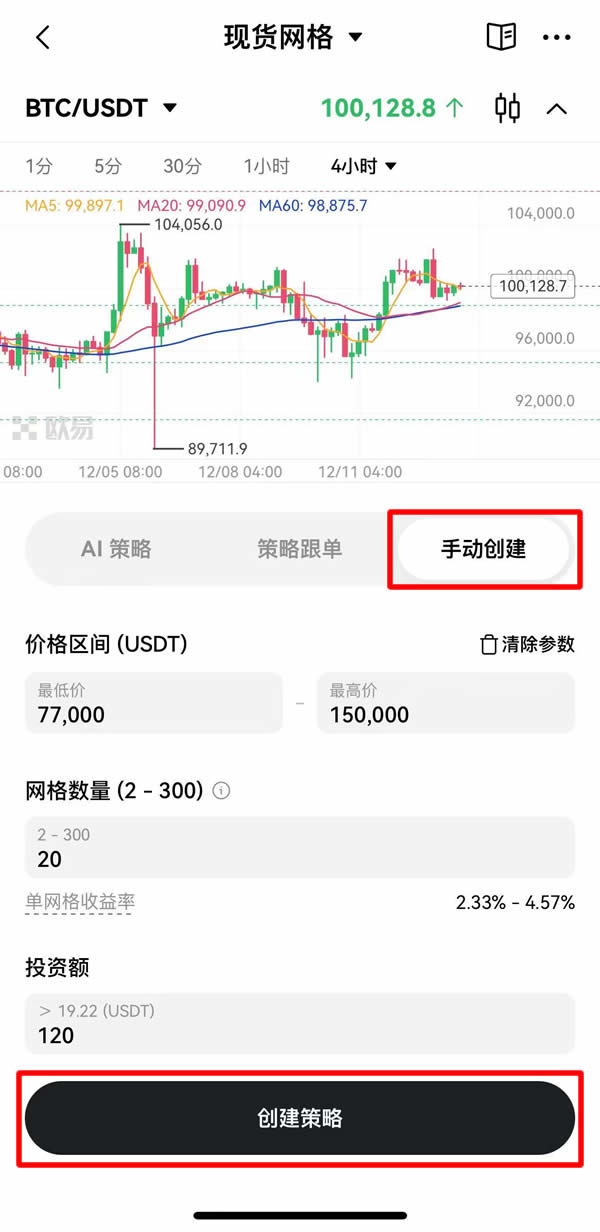 okx 现货网格步骤三:设定网格参数,点击「创建策略」