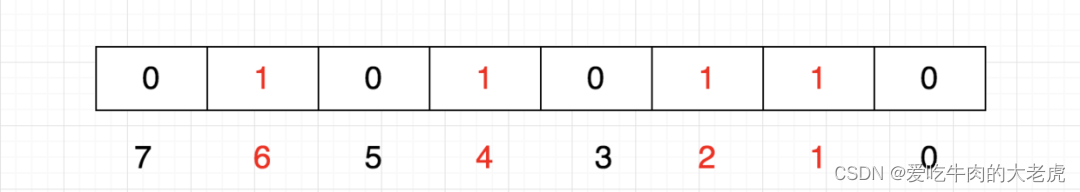 bit-map的每一位表示一个数,0表示不存在,1表示存在,这正符合二进制,这样我们可以很容易表示{1,2,4,6}这几个数: