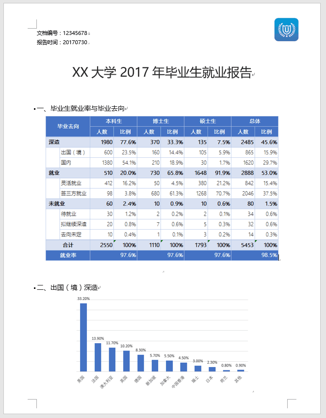 这是一个某大学年度毕业生就业报告,其中表格和统计图的数据来自数据库,如果通过报表工具,制作这样的表格和统计图是轻而易举的事情,但如果要把这些报表和统计图做到 word 报告里就麻烦很多。以往有两个办法:一个是每次做好报表和统计图之后,导出为 word,再手工复制粘贴到 word 报告中;第二个是把整个报告都做成一个报表模板,然后再一起导出为 word。 方法一,纯手工操作效率低;方法二,报表工具排版能力有限,生成的 word 版面效果不够完美。