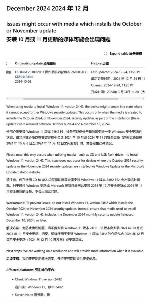 微软公司于 12 月 24 日更新支持文档,承认用户如果使用优盘或者磁盘安装含有 10/11 月安全更新的 windows 11 24h2 系统,可能导致 windows update 功能无法正常使