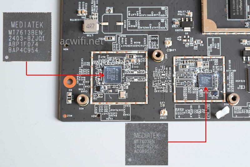 无线射频方面,2.4g无线芯片是mt7603en,支持2x2mimo,最高速率300mbps;5g无线芯片是mt7613ben,支持2x2mimo,最高速率1201mbps。2.4g和5g均没有使用外置的独立fem芯片,都用了无线芯片内置的。