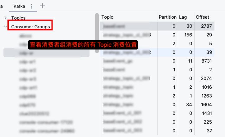 可以通过消费者组查看其消费的 topic 和消费位置,有助于分析消息处理的延迟与状态。