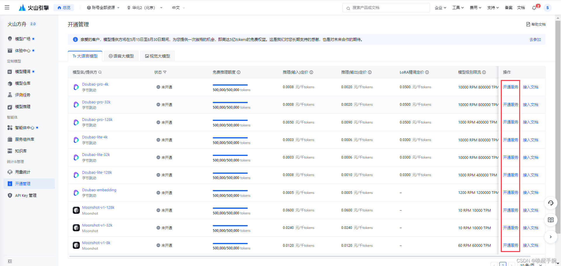 您可以在 开通管理 页中查看各模型定价与使用限制,开通后使用各模型服务,不同模型的单价不同。其中,大语言模型费用计算方式:费用 = tokens使用量 x 模型 tokens 单价。