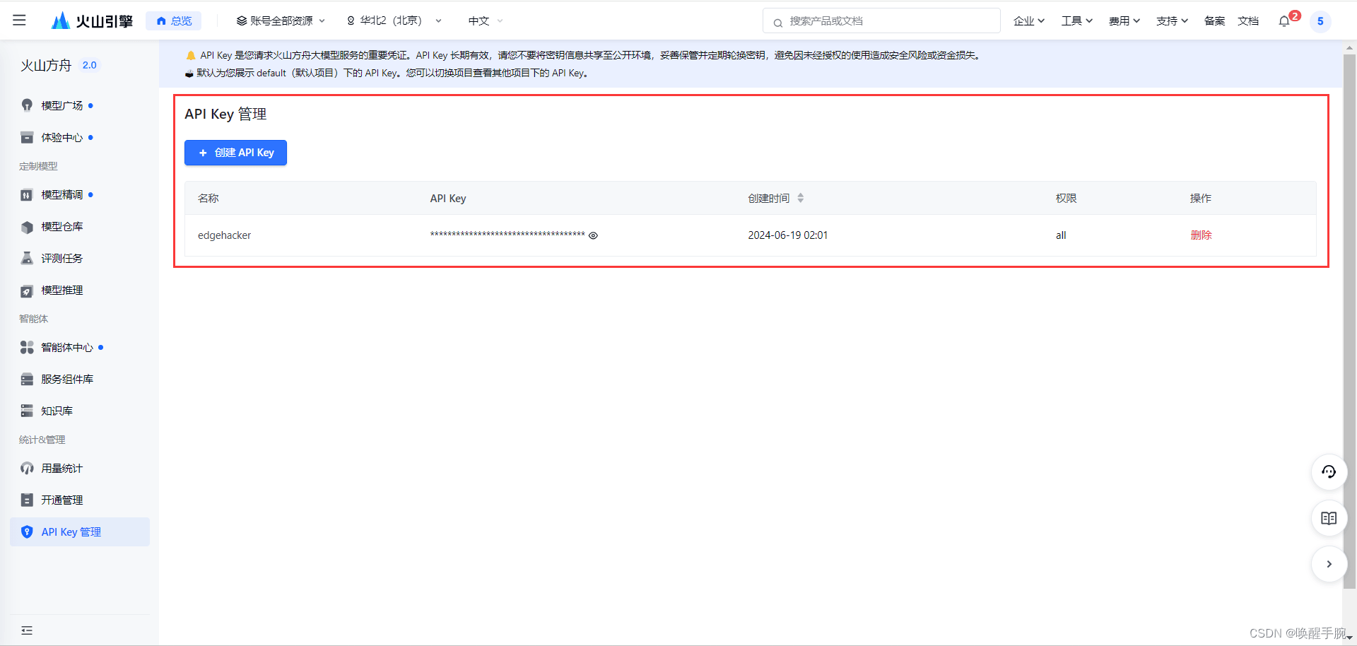 进入 api key 管理 页面,选择需要的项目,点击 创建 api key,即可生成长效 api key。all权限默认给予项目下所有模型接入点和智能体访问权限。地址:https://console.volcengine.com/ark/region:ark+cn-beijing/apikey