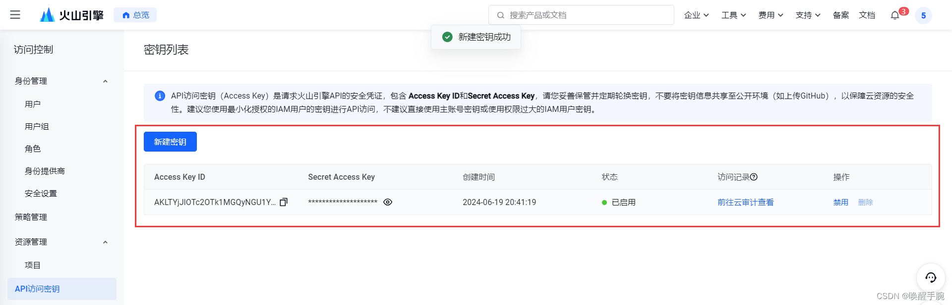 访问密钥 access key 管理:https://console.volcengine.com/iam/keymanage