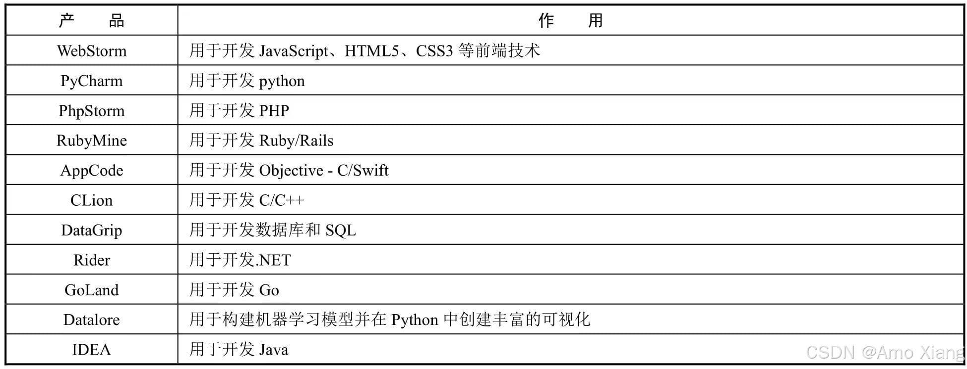 intellij idea 简称 idea,是 jetbrains 公司的产品,jetbrains 公司的主要开发工具如下表所示: