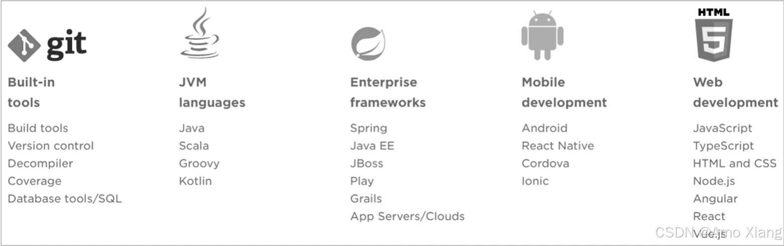 idea 是 java 的集成开发工具。idea 在业界被公认为是最好的 java 开发工具之一,尤其在智能代码助手、代码自动提示、重构、javaee 支持、ant、junit、cvs 整合、代码审查、创新的 gui 设计等方面的功能可以说是超常的。idea 内置的工具和支持的框架如下图所示: