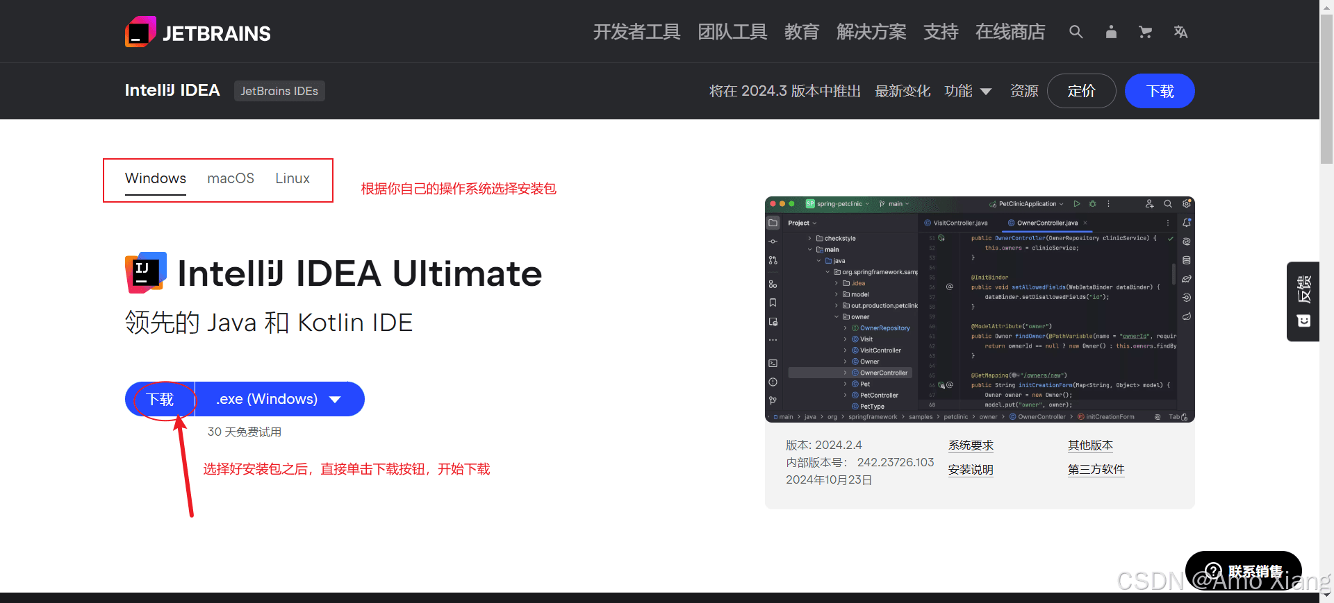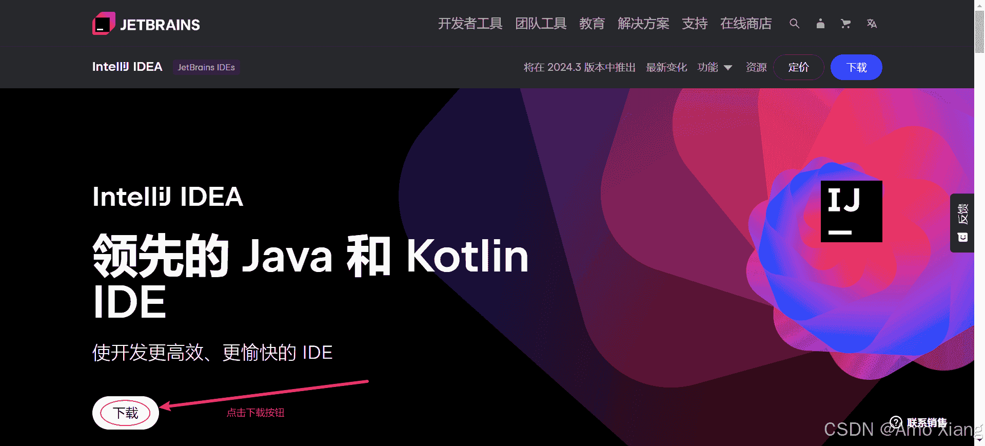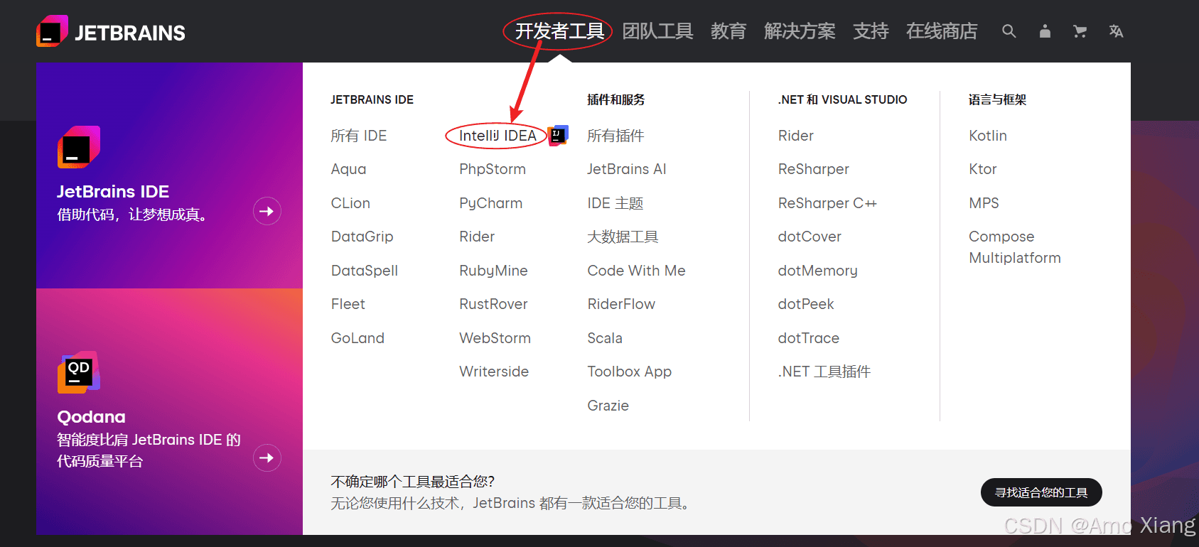 浏览器打开网址:https://www.jetbrains.com.cn/idea/,选择开发者工具下的 intellij idea,如下图所示: