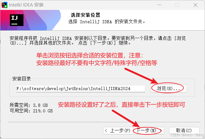 接下来需要指定 idea 的安装路径,如图下图所示,idea 软件需要的磁盘空间相对较大,请检查计算机是否有足够的空间。如果想要 idea 运行得更快,那么还可以考虑安装到固态硬盘对应的空间中。