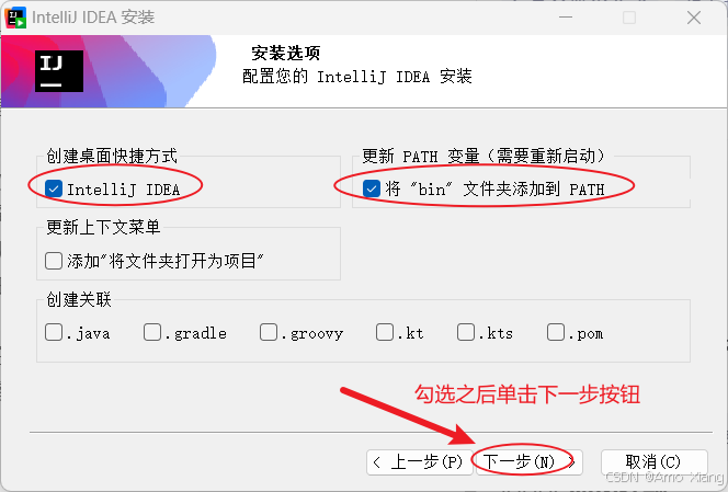 - 是否自动在 path 环境变量中加入 idea 的 bin 目录路径,建议勾选此复选框。