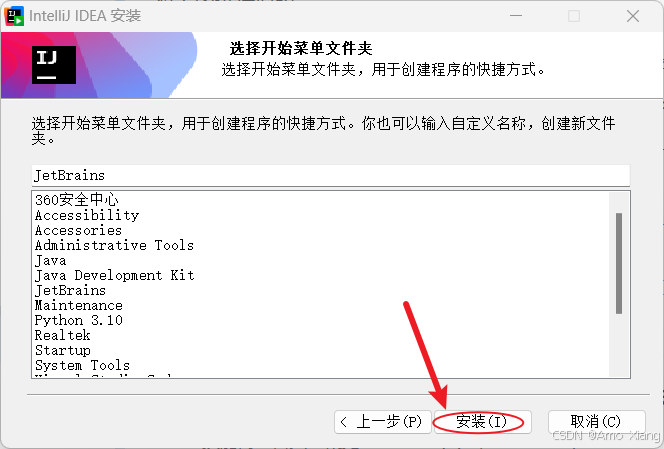 下一步会提示创建 idea 在 windows 开始菜单中的程序文件夹,默认是 jetbrains 目录,不建议修改,直接点击 "安装" 按钮开始安装即可,如下图所示: