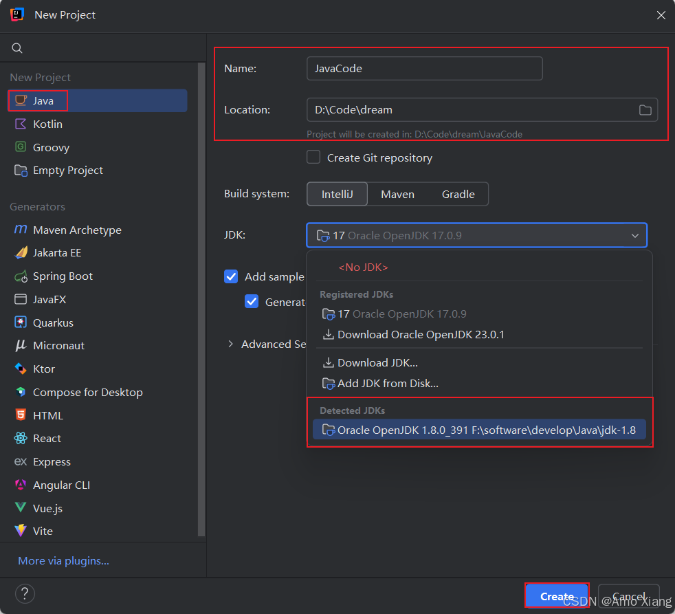 因为要创建的是 java 工程,所以选择工程类型为 java,设置项目的存储位置以及名字,紧接着在下拉列表中选择计算机上安装的某个版本的 jdk 作为当前项目的 project sdk,如选择 "17 oracle openjdk 17.0.9",如下图所示: