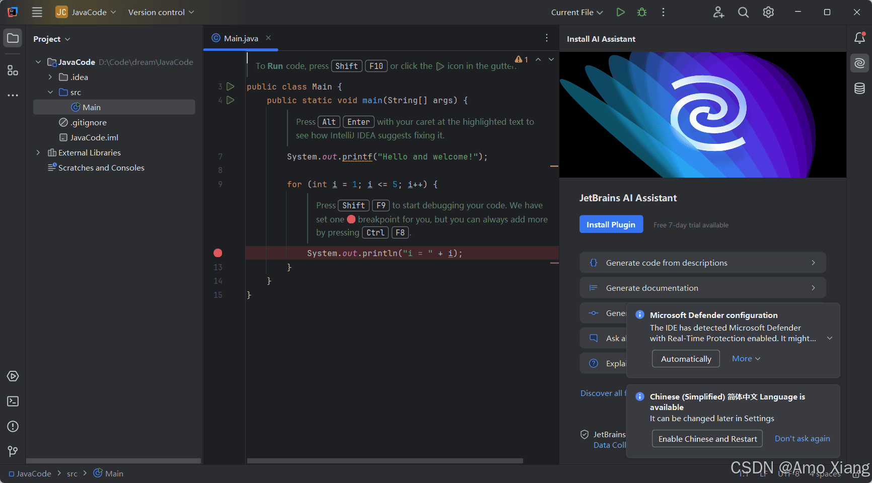 其中 17 就是指 jdk 17,而 17.0.9 是小版本号,这个大家可能会不同。然后单击 create 按钮创建项目。单击 create 按钮就可以正式进入 idea 的开发界面了,如下图所示: