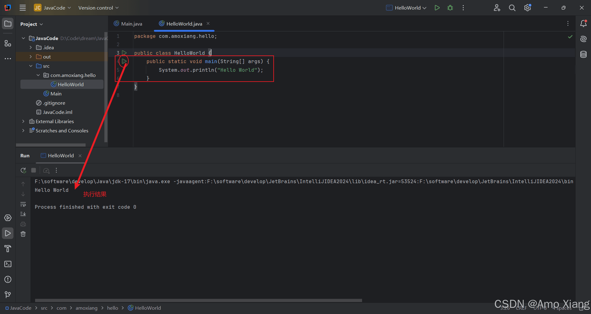 - 编译并运行代码。java 程序的入口是 main 方法,所以可以在类 helloworld 中声明 main 方法,输出