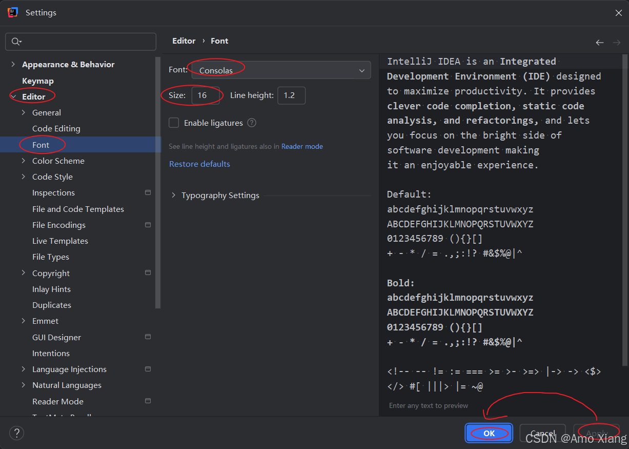 整天面对计算机是非常费眼的,因此选择合适的字体大小就显得尤为重要,可以减轻眼睛的疲劳度。单击 "file"→"settings..."→"editor",然后找到 "font",选择自己喜欢的字体和大小即可,如下图所示,单击 "apply" 表示立即应用新配置。