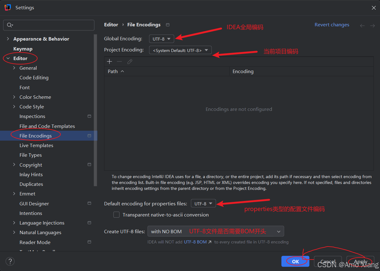 字符编码是编程人员一定会遇到,而且是非常令人头疼的问题,那么统一字符编码是每个工程开始前必须做的事情。单击 "file"→"settings..."→"editor",然后找到 "file encodings", 选择字符编码方式即可,如下图所示,如果没有特殊要求,工程字符编码统一都是 utf-8,单击 "apply" 表示立即应用新配置。